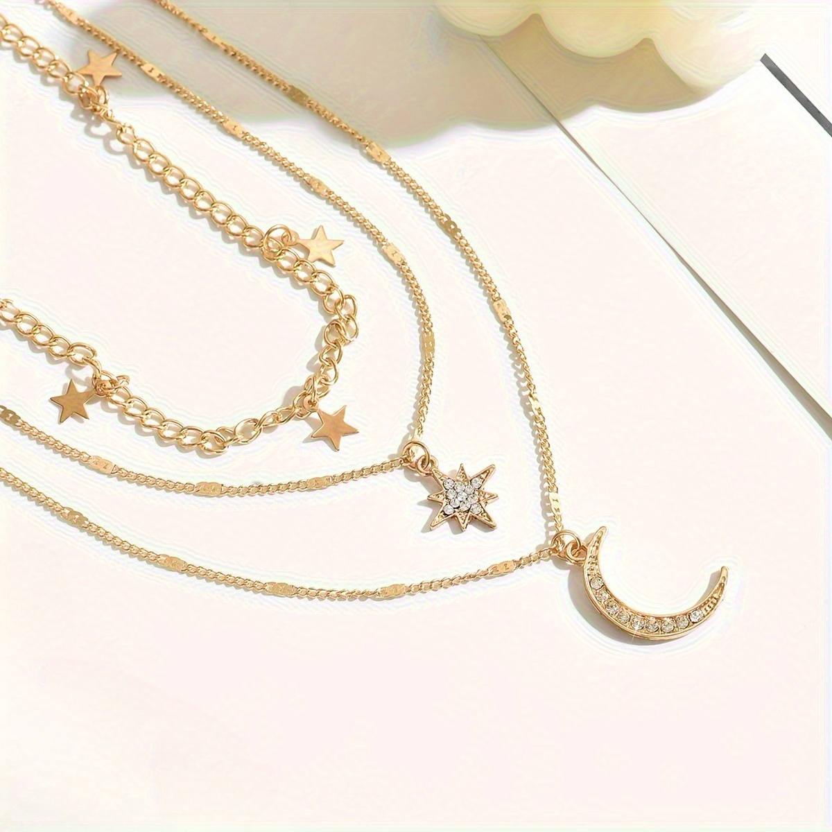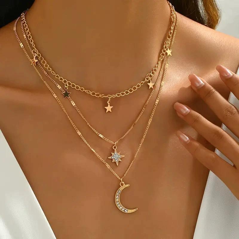 Boho-chic layered necklace with celestial charms — golden tones that match your glow.